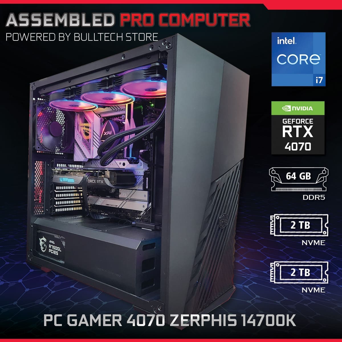 El poder está en el hardware, en el corazón de tu computadora ASSEMBLED PRO COMPUTER. Nuestra “PC Gamer 4070 Zerphis 14700K” está construída con componentes de alto desempeño. Una computadora lista para las tareas más exigentes. Esta PC Gamer te ofrece un rendimiento superior, gráficos más detallados, personalización avanzada y la posibilidad de acceder a experiencias de juego exclusivas.