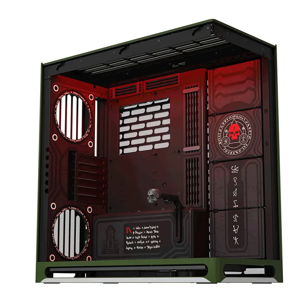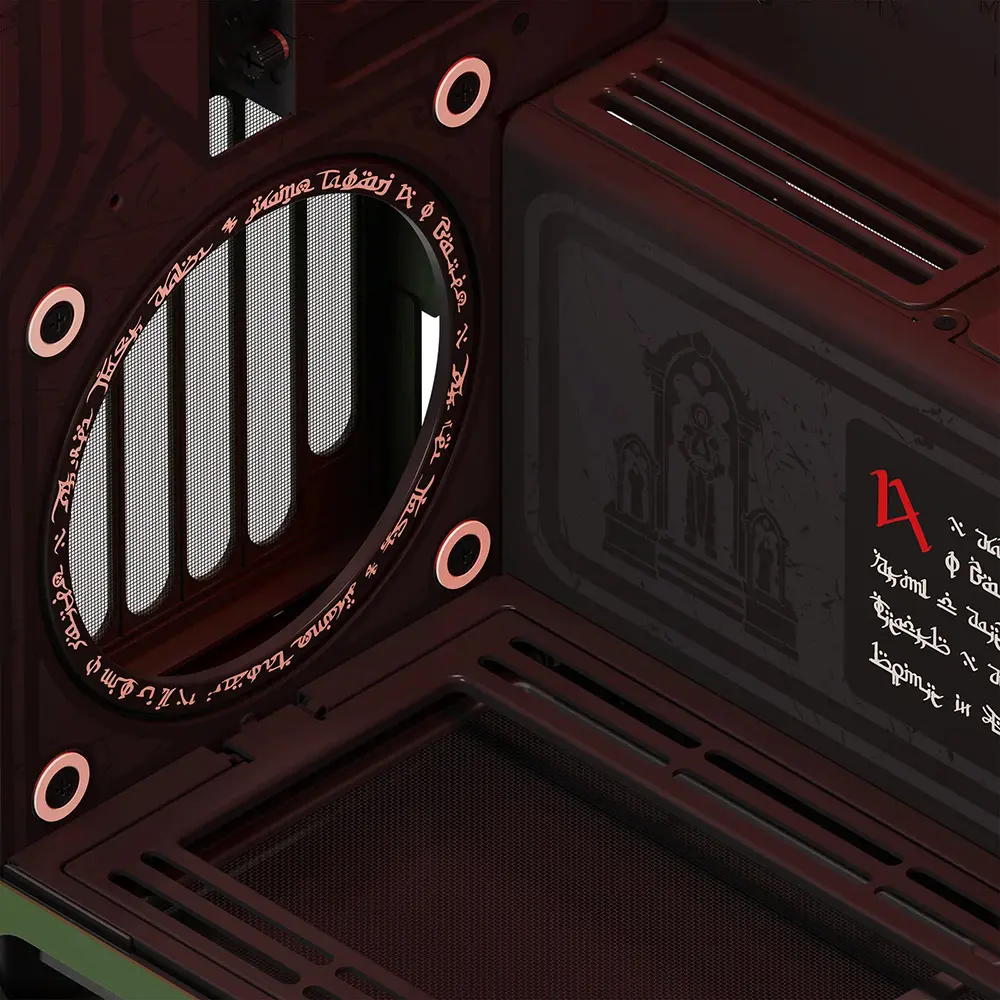 ¡Defiéndete y lucha, Slayer! La HAVN HS 420 DOOM: The Dark Ages Edition es la caja de PC definitiva para Slayers. Esta caja de torre media está coloreada a juego con la armadura del DOOM Slayer y adornada con sigilos y runas serigrafiados multicapa. Para completar el diseño, cuenta con una tira LED iluminada como el nodo de energía del Traje Pretor y un accesorio de calavera magnética. Bajo su impactante estética gótica se esconde la distintiva Estructura Híbrida HS 420, un diseño de doble cámara diseñado para optimizar el flujo de aire y la refrigeración de la GPU. Esta caja de PC no solo es elegante: es una pieza imprescindible para los fans de DOOM.