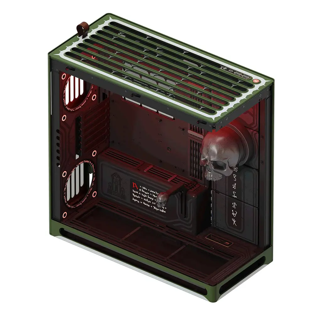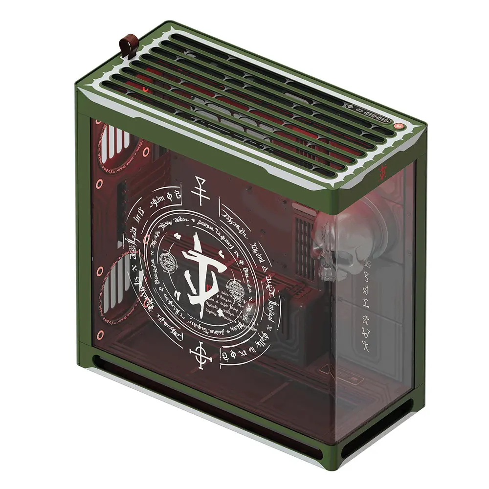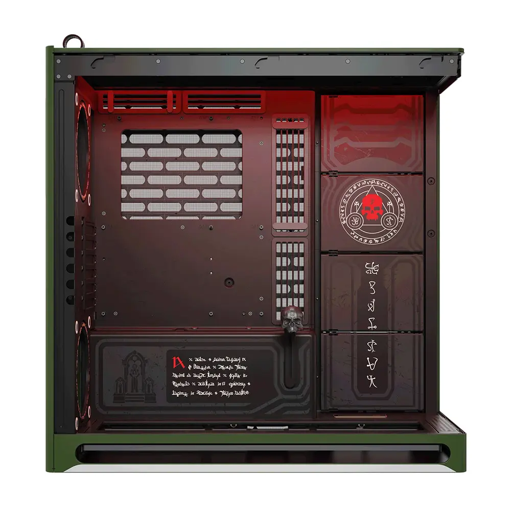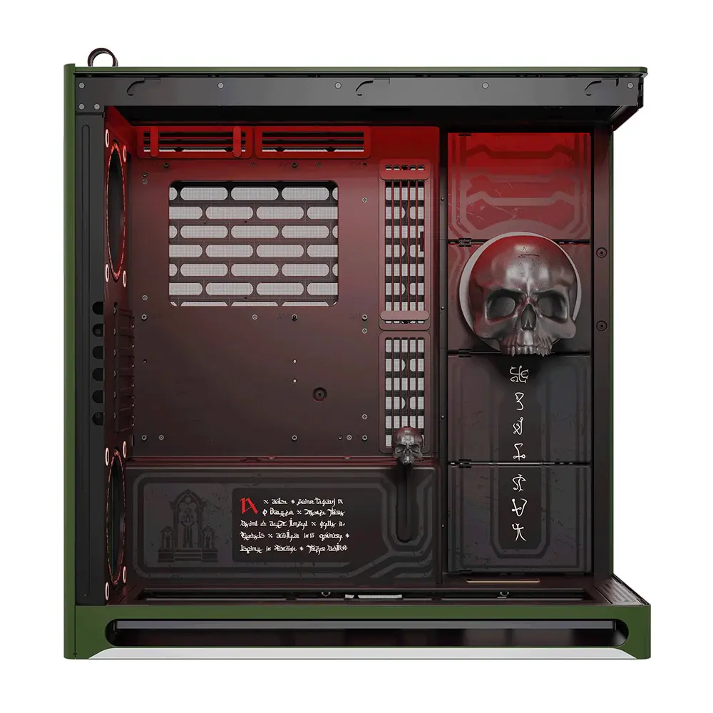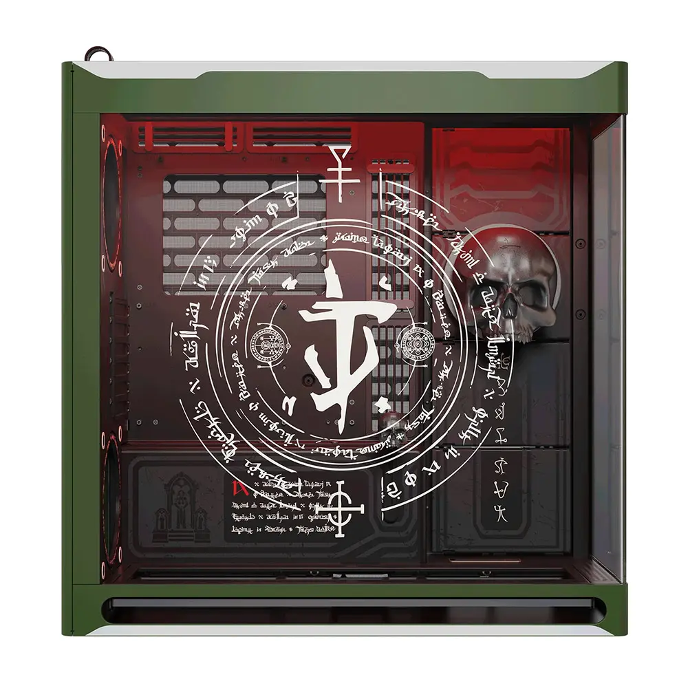 Impresión DOOM multicapa: el exterior es de un llamativo verde DOOM Slayer acentuado con detalles metálicos que evocan la armadura del traje Praetor, mientras que el panel de vidrio templado UniSheet y las superficies interiores cuentan con sigilos y runas blancos serigrafiados en múltiples capas.
