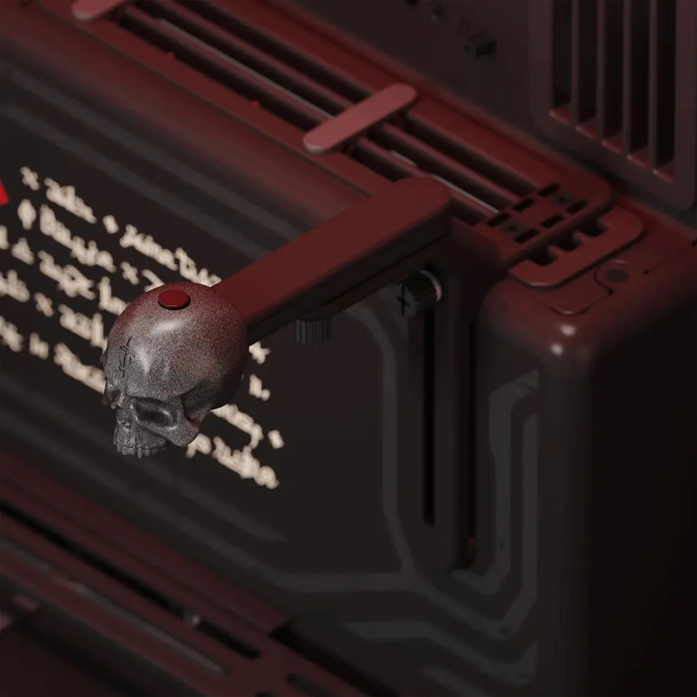 Accesorio exclusivo de calavera magnética DOOM: Una estilizada calavera metálica magnética. Coloca la gran calavera dentro de la carcasa para cubrir el depósito de refrigeración o móntala en el exterior como un robusto soporte para auriculares. Tu trofeo, a tu manera.